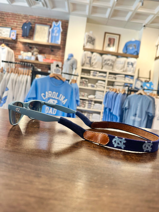 UNC Sunglass Strap with Navy Needlepoint and Leather Details