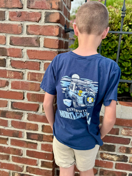 Carolina Tar Heels Navy Blue Jeep on the Beach Kid's T-Shirt