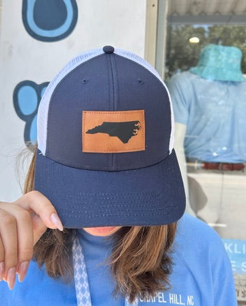 North Carolina Trucker Hat in Navy and White with Leather NC Patch
