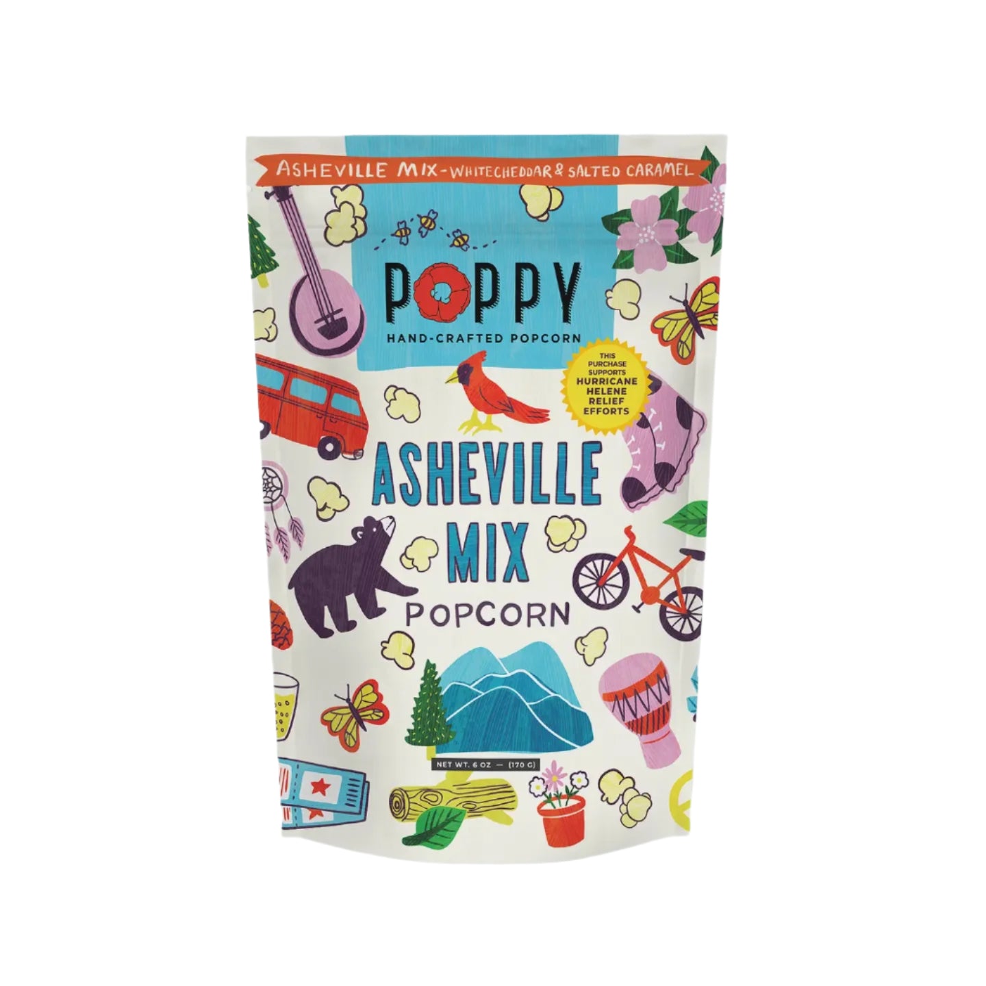 White Cheddar and Salted Caramel—two beloved Poppy flavors in a limited-edition bag with a mission. This vibrant bag, created in collaboration with Asheville artist Annie Riker, celebrates the spirit of our mountain home. It’s perfect for your shelves and for customers who want to make a difference—one bag at a time.