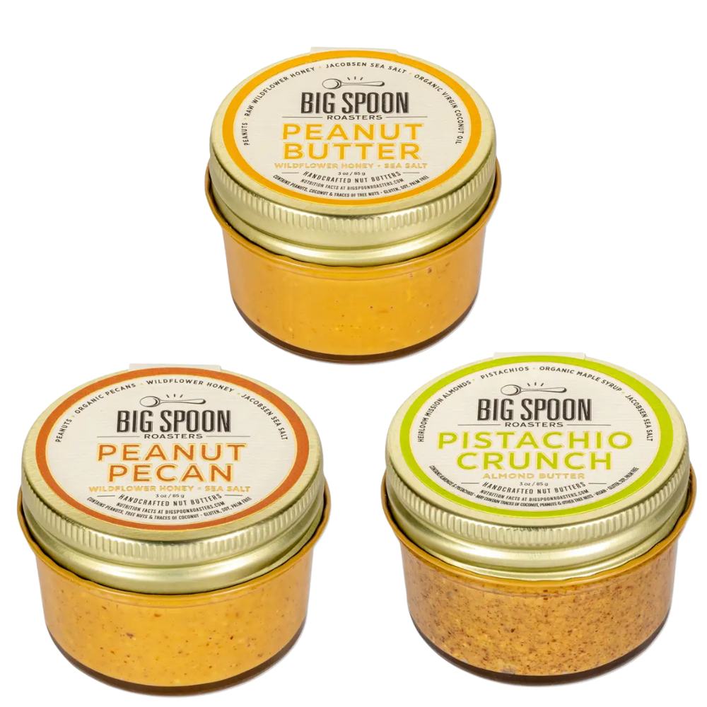 The perfect bundle of Big Spoon 3 oz jars of Pistachio, Pecan, and Peanut Butters made locally in North Carolina!