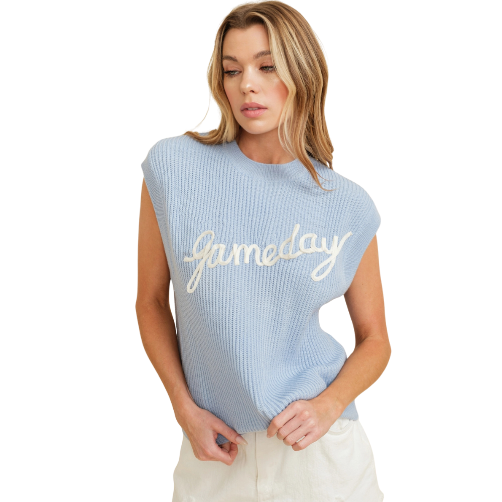 Step out in style with this gorgeous Carolina Blue 'GAMEDAY' Embroidered Sleeveless Sweater Vest. This preppy, contemporary fit vest with a boat neck is perfect for a day party in spring/summer. It's not just a sweater vest, it's a statement. Get ready to redefine your gameday style!