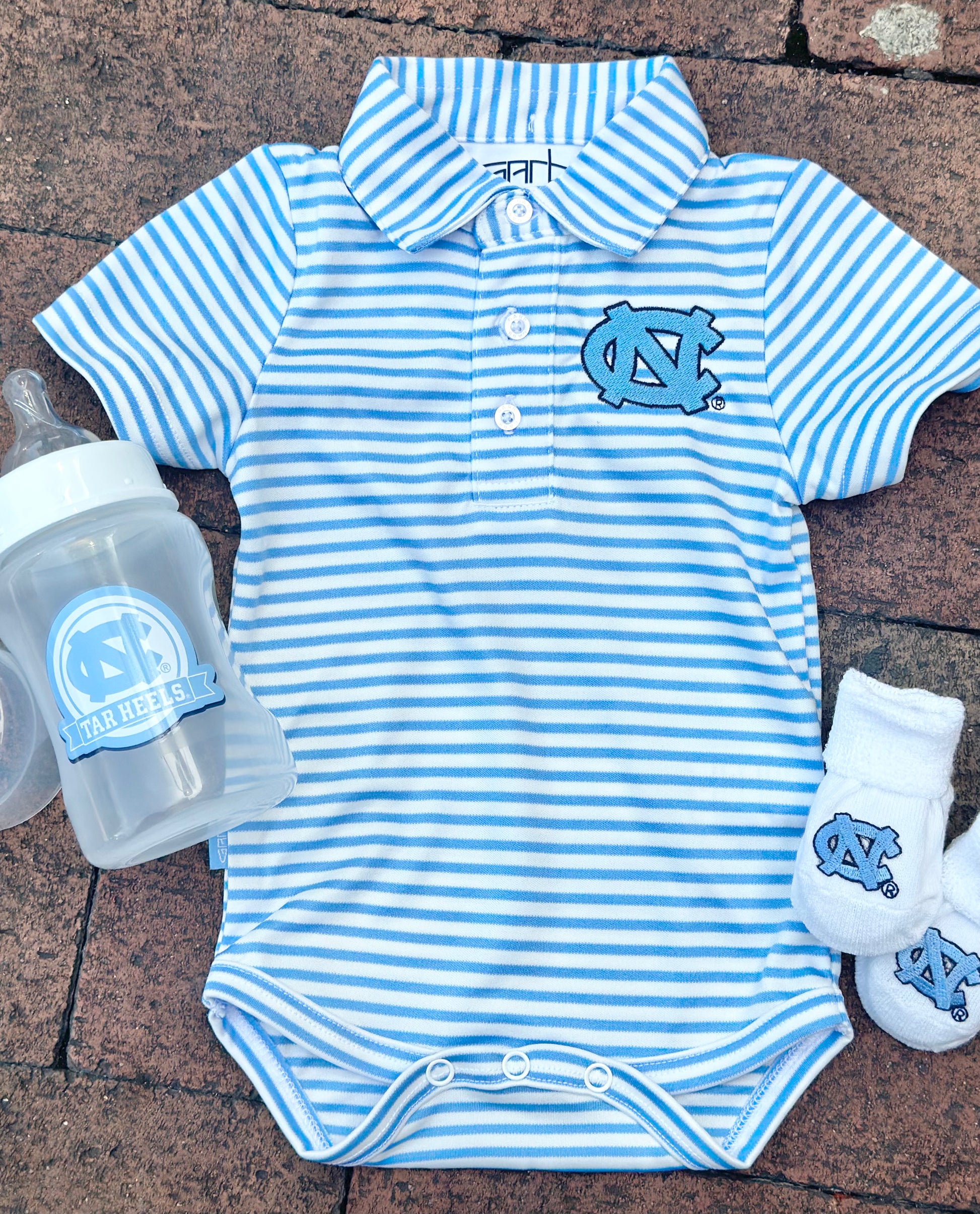 Let your tiny Tar Heel shine in this Carolina Blue Classy and Comfortable UNC Tar Heels Polo Onesie for babies! This adorable Carolina Blue and White Striped UNC Polo Onesie is the perfect way to dress your little one for Game Day or any formal event! Make sure your little UNC Fan is dressed to impress in this awesome Carolina Tar Heels Polo Onesie.