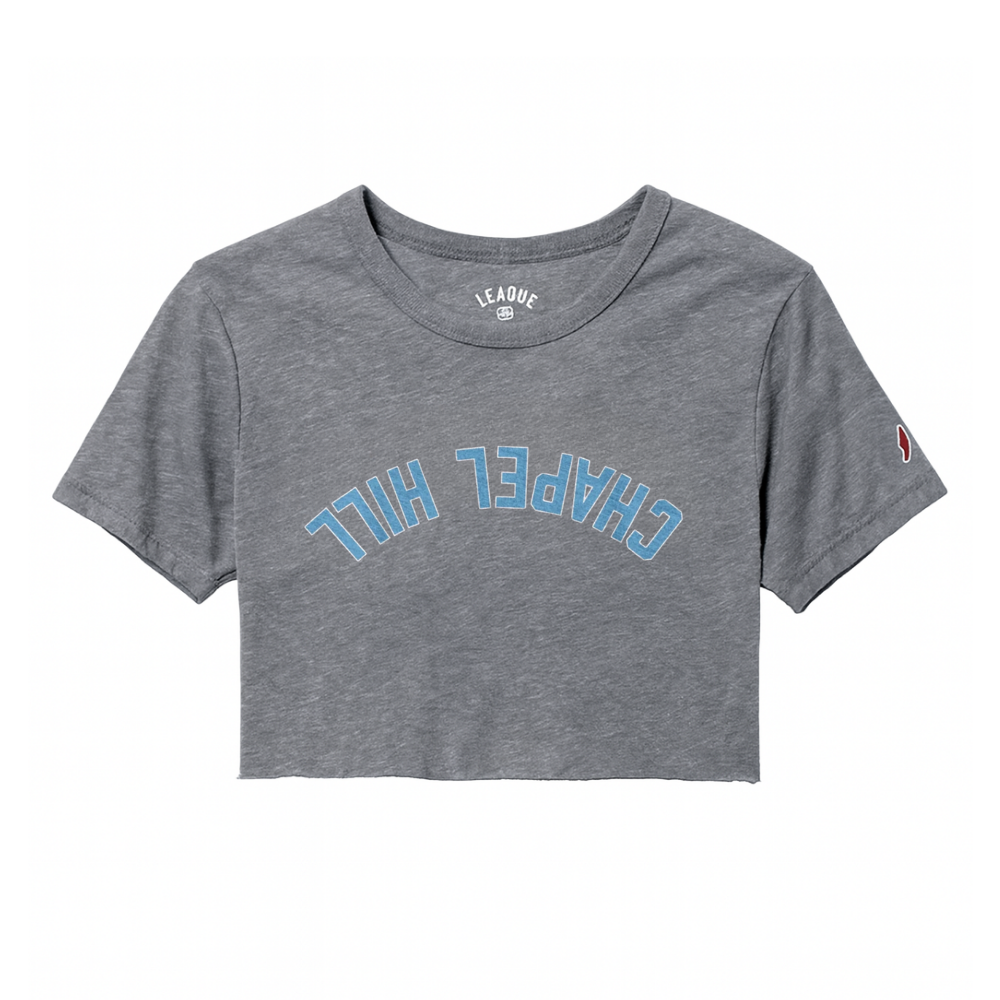 Rep Chapel Hill in effortless style with this hand-cropped gray upside down CHAPEL HILL tee! Featuring soft cotton-blend fabric and arched Carolina blue CHAPEL HILL lettering, each shirt is cropped by hand for a unique, laid-back look. Perfect for pairing with high-waisted jeans or shorts for a sporty, vintage vibe. Go Heels!