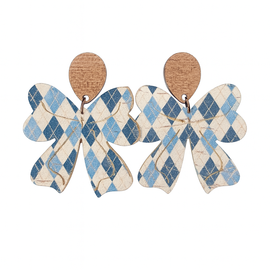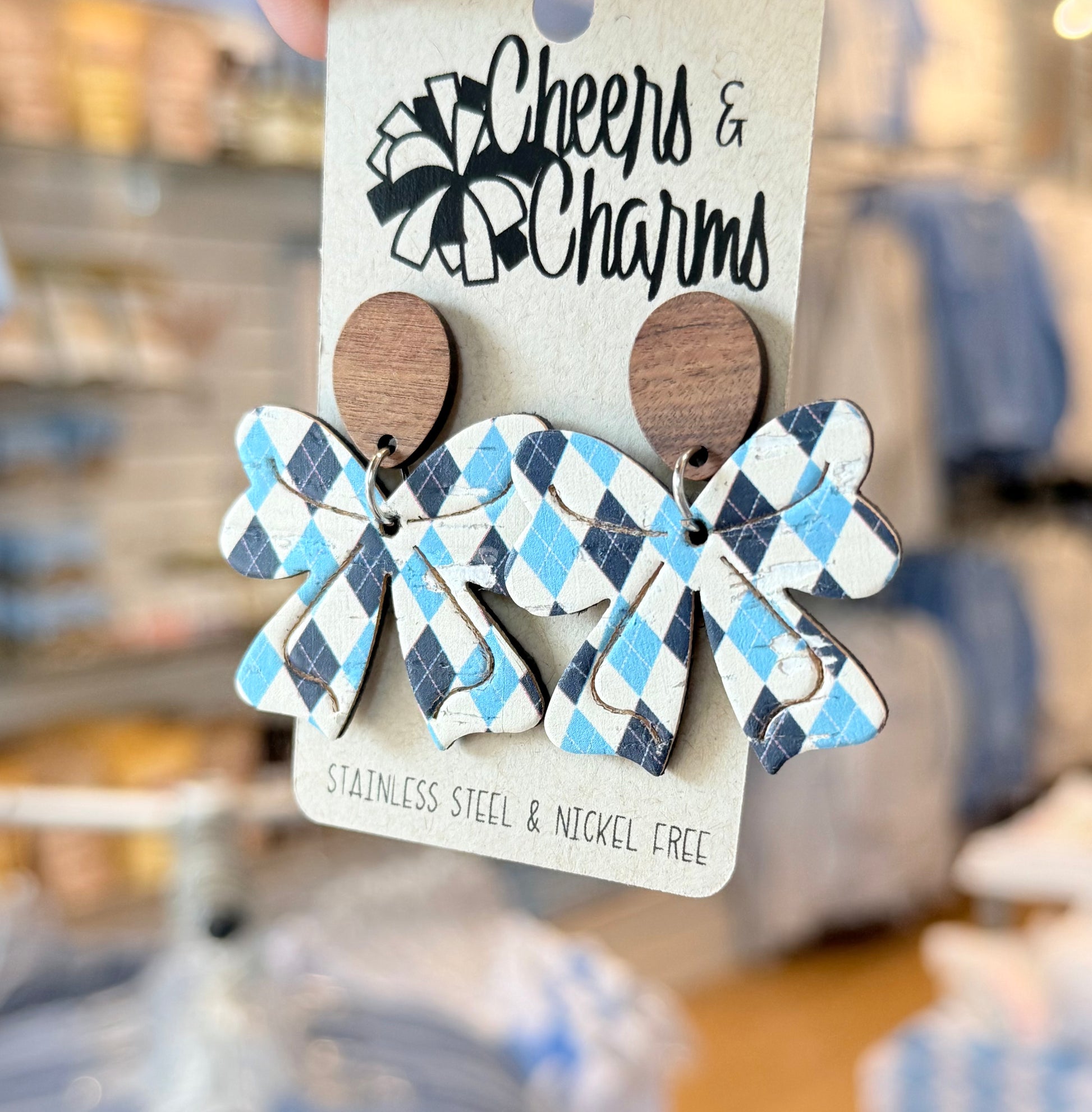 Cheers and Charms Carolina Blue Argyle Bow Earrings