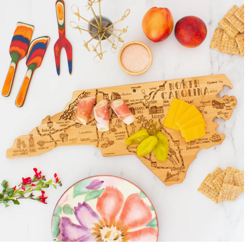 Celebrate North Carolina with this beautifully crafted bamboo cutting board! Shaped like The Tar Heel State, it features laser-engraved artwork highlighting the iconic towns, landmarks, and sights that define North Carolina. Shoppers love using it as a fun, conversation-starting charcuterie board for serving crackers, cheese, meat, fruit, candy, and other favorite snacks. The blank reverse side offers all the benefits of a bamboo cutting board: a durable, lightweight, and knife-friendly cutting surface. Cut on the back and serve on the front to minimize clean up! When not in use, the included hang tie easily transforms the cheese board into eye-catching home decor.