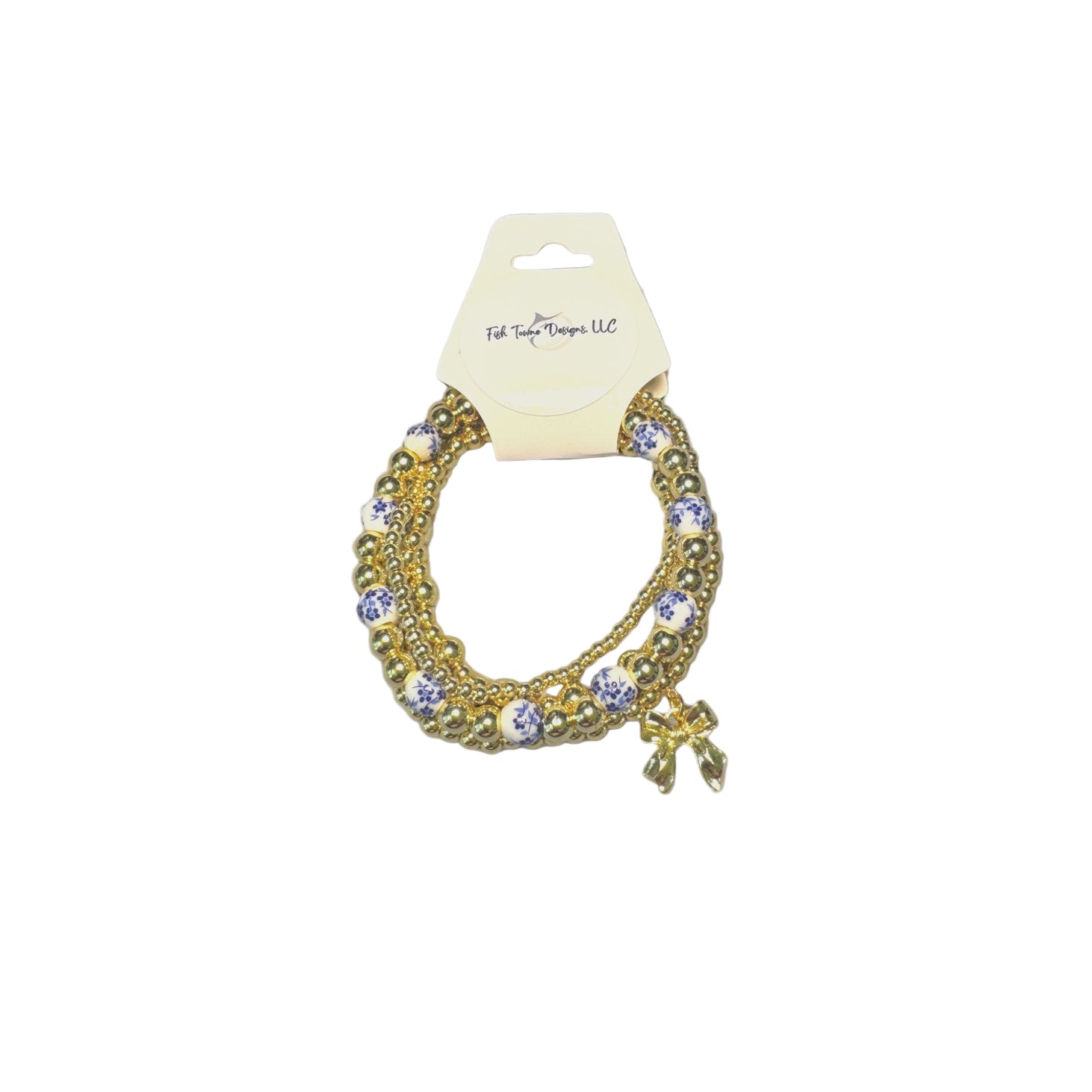 This elegant set of 4 stretch bracelets features gold-toned hematite beads, delicate blue-and-white chinoiserie-style accents, and a polished gold bow charm for a feminine touch. Each bracelet offers a unique texture or bead size, creating a cohesive layered look that’s perfect for boutiques seeking classic-meets-modern accessories. Lightweight and comfortable with a stretch fit that suits most wrist sizes, this stack can be worn together or separately for versatile styling. Set of 4 stretch bracelets Gold-tone hematite + ceramic accent beads Bow charm detail Available in three sizes Handmade in the USA A beautiful, giftable piece for jewelry displays, perfect for spring markets, holidays, or year-round elegance.