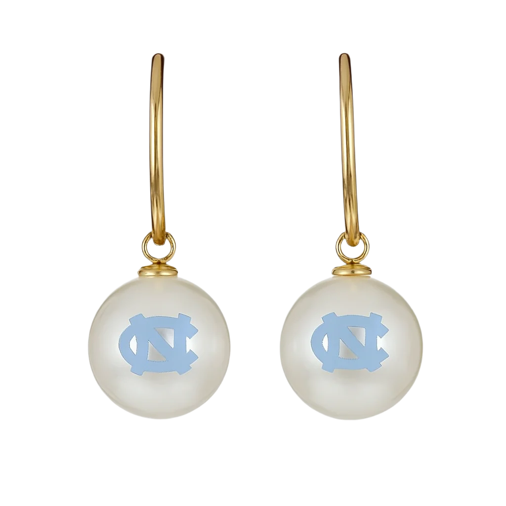 Round 10mm imitation pearl stud earrings featuring the North Carolina logo dangling off a sleek gold hoop.