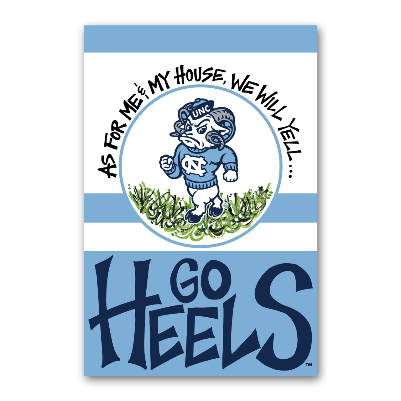 Show your love for the North Carolina Tar Heels with this awesome Rameses featured UNC Garden Flag in stunning Carolina Blue! Officially Licensed UNC Garden Flag featuring a Tar Heels Mascot, RAMESES, North Carolina Logos, and the iconic phrase "As for me and my house, we yall...GO HEELS"
