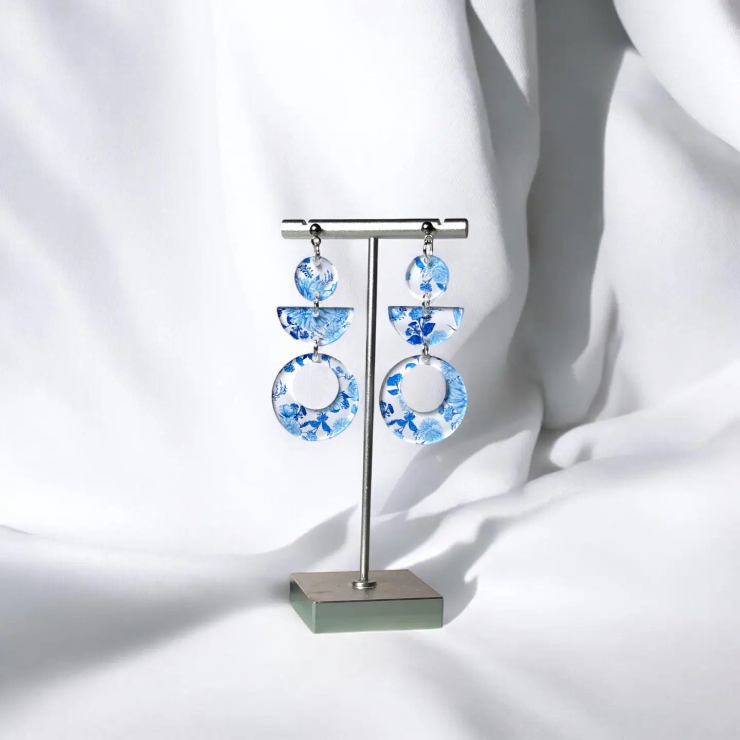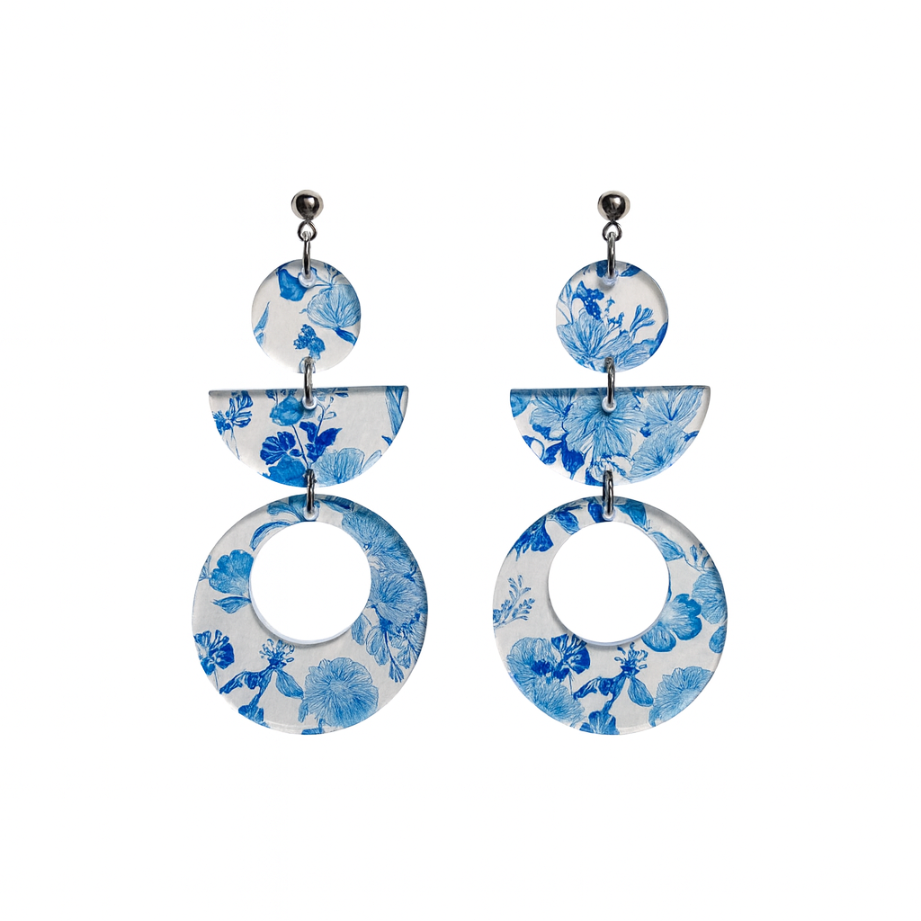 Bring a touch of Grecian elegance to your accessory collection with our Santorini-inspired acrylic earrings. Featuring a breathtaking blue-and-white floral design reminiscent of the iconic Cycladic architecture and serene Aegean Sea, these earrings will transport you to the sun-soaked shores of Santorini with every wear. Features: Materials: High-quality acrylic with a clear base and intricate floral detailing. Hypoallergenic stainless steel posts for sensitive ears. Dimensions: Approximately 2.5 inches long, offering the perfect balance of boldness and elegance. Design: Inspired by the timeless beauty of Santorini, with a modern geometric twist.
