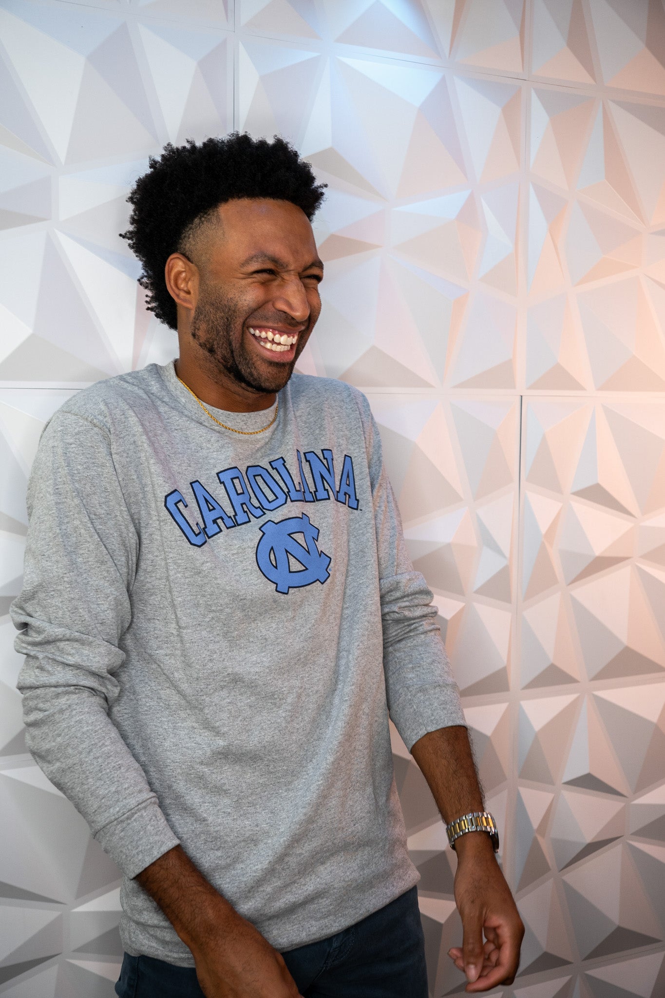 Trademarked and screen printed arched Carolina Logo over the iconic UNC interlock logo