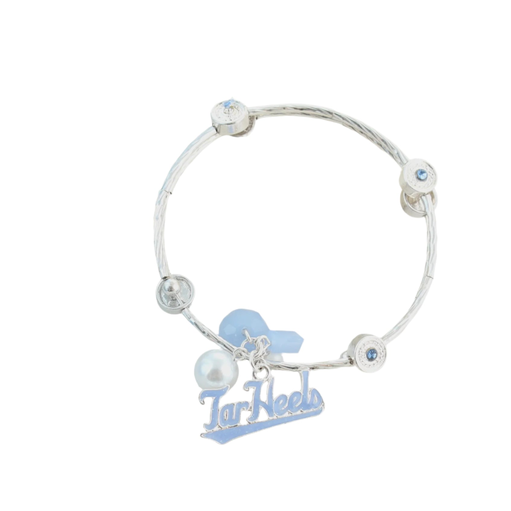 Silver plated wrap bracelet featuring light blue rhinestones, beads and enamel with imitation pearl bead accents and the “Tar Heels” slogan. This is an officially licensed product.