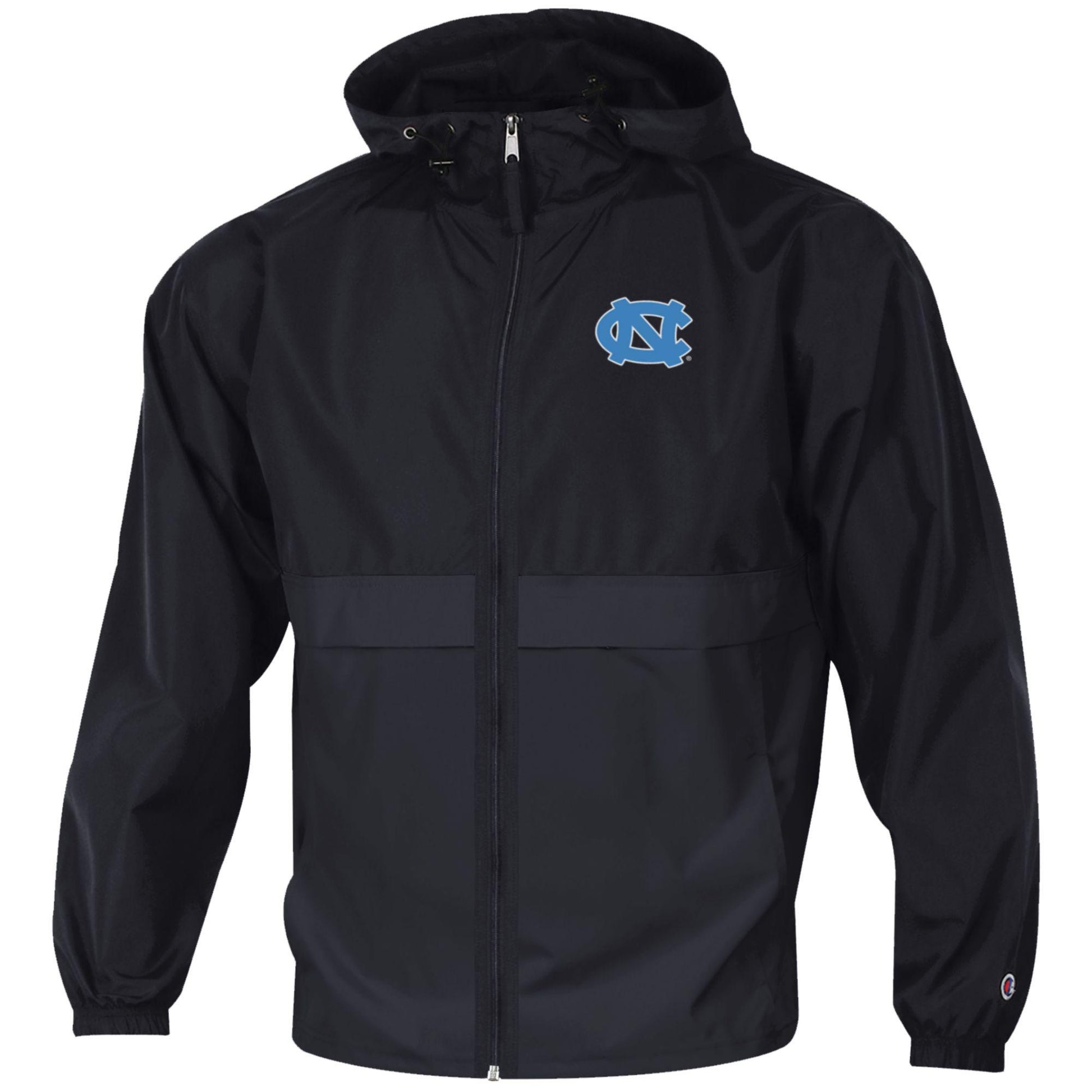 Whether you need to be prepared for wind and rain, take this awesome UNC Rain Jacket by Champion available in classic Black. Officially Licensed Carolina Tar Heels Logos and features a water resistent coating, scuba collar with hood including shock cords, lower front on-seam pockets, and elasticated cuff to block wind.