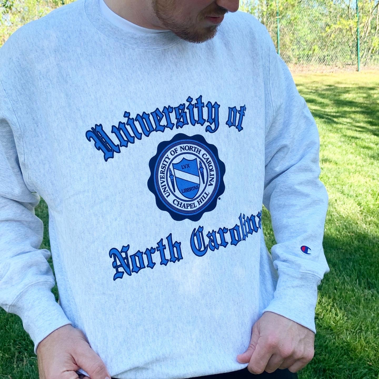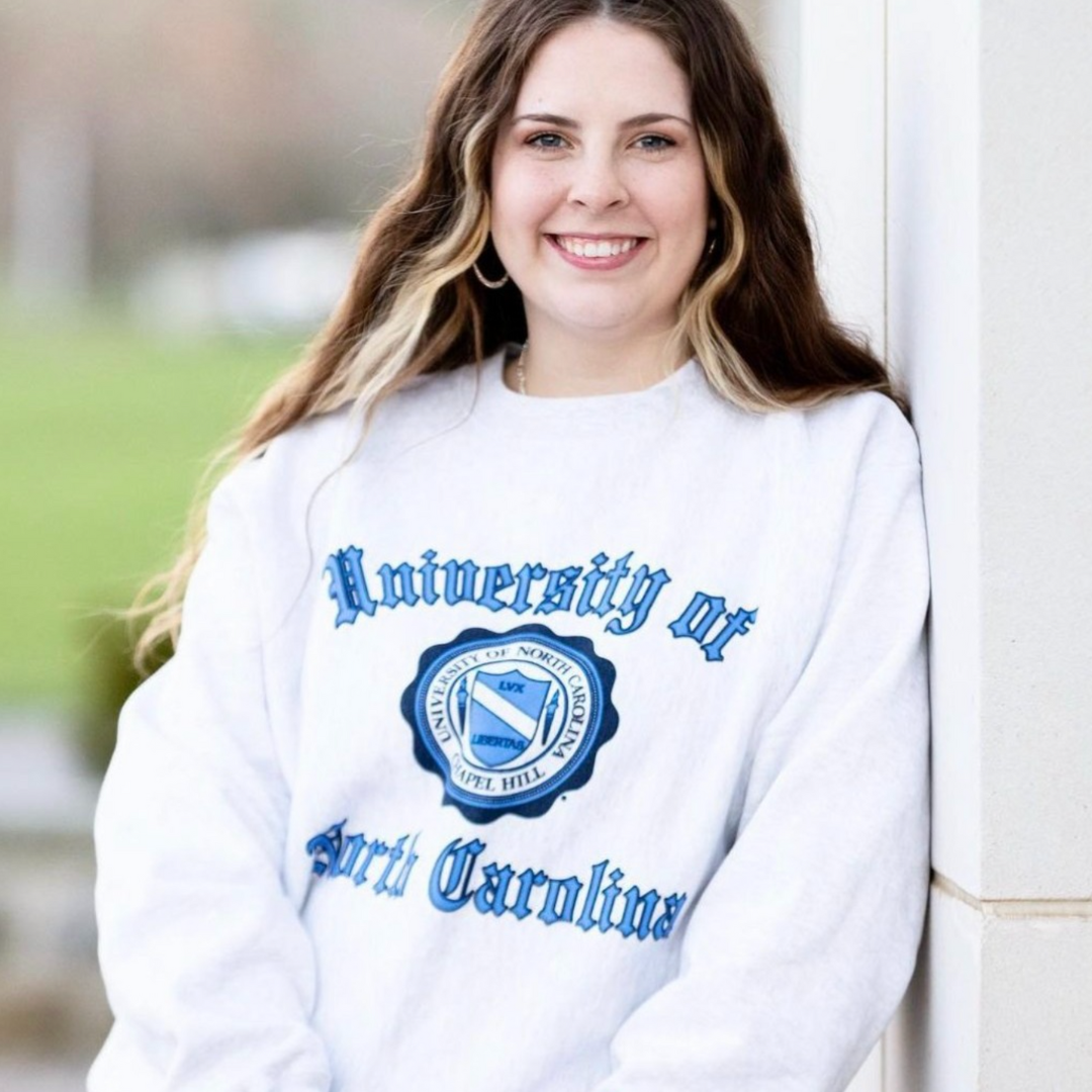 Vintage UNC Sweatshirt for the truest of Tar Heels! This UNC Seal Sweatshirt was recreated from a design the Shrunken Head sold DECADES ago making it the most authentically vintage UNC sweatshirt you will find on the market! Shrunken Head is the oldest in the Tar Heel game and we thought yall deserved some UNC Vintage Designs pulled out of the vault! Replicated onto the best of the best, this Champion Reverse Weave sweatshirt is known among fans as the Cadillac of Crewneck Sweatshirts, in stunning silver ash grey with officially licensed University of North Carolina logo in a classic vintage college font and surrounding the UNC Tar Heels official seal- this UNC Sweatshirt is the ultimate collegiate crew for any student, alumni, or fan of the University of North Carolina. Represent your favorite school in this ultimate sweatshirt, the Champion Reverse Weave Crewneck North Carolina Sweatshirt.