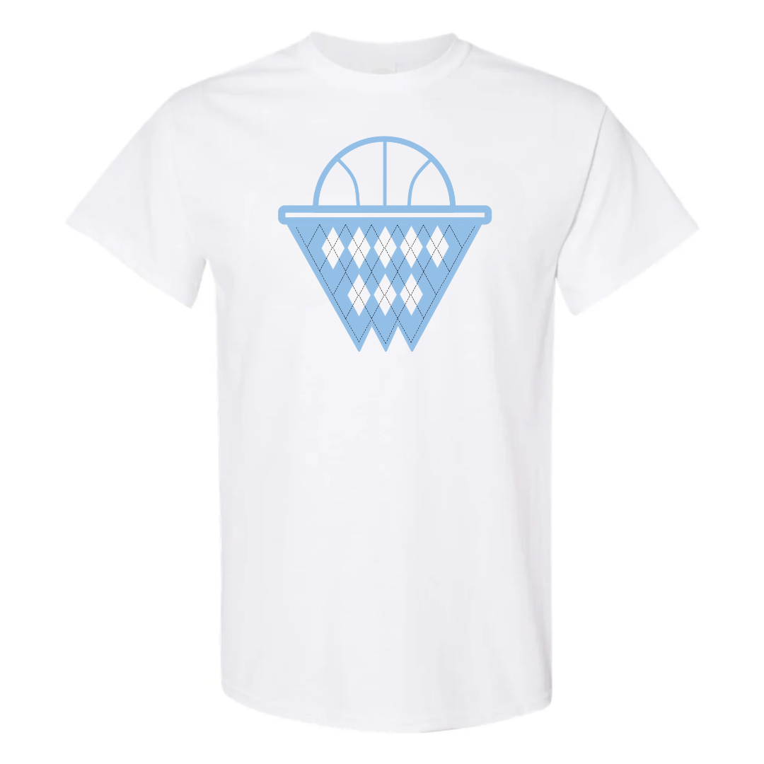 Rep your Tar Heel pride with style in this unique Carolina Argyle Net Tee. Featuring a clean, minimalist design, the shirt showcases a custom graphic that cleverly fuses a basketball hoop with the iconic Carolina argyle pattern—instantly recognizable and undeniably UNC.