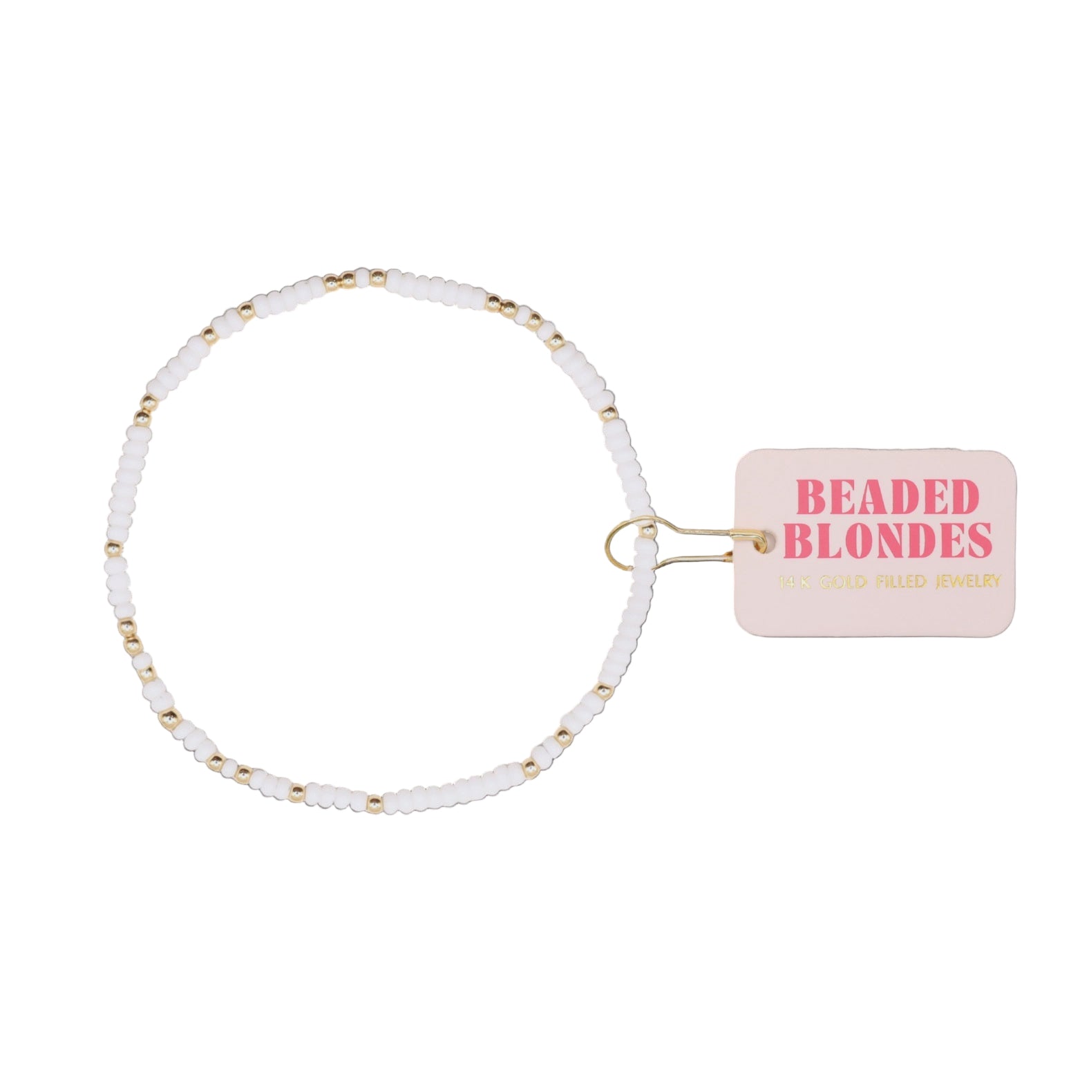 This beautiful dainty white bracelet has 14k gold filled beads!